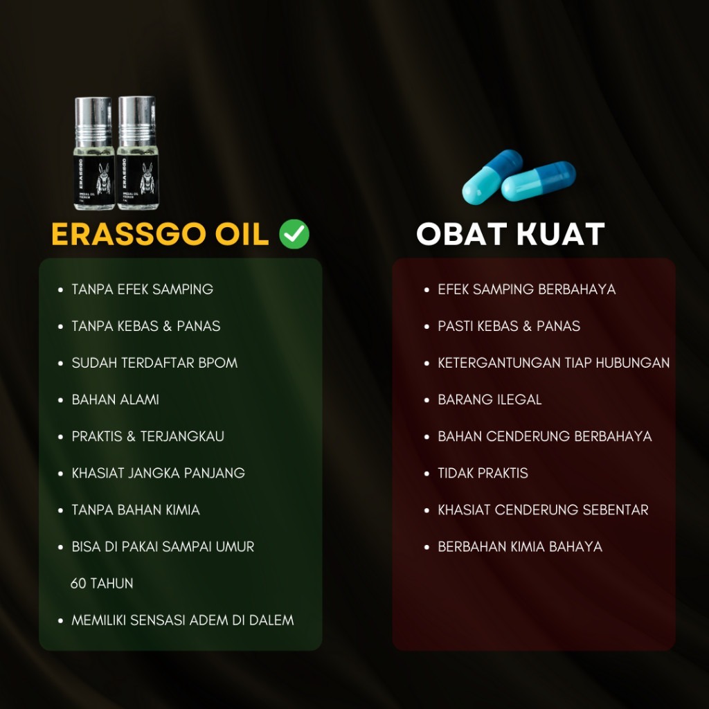 ERASSGO memiliki manfaat sangat berguna bagi para pria untuk memenuhi kebutuhan istrinya saat berhubungan intim, karena erassgo sudah formulasikan khusus untuk membantu kepuasan suami istri dalam berhubungan sex yang merupakan satu hal yang sangat penting dalam keharmonisan rumah tangga. ERASSGO OIL membantu mengatasi berbagai masalah yang dapat mempengaruhi kehidupan pria dewasa.